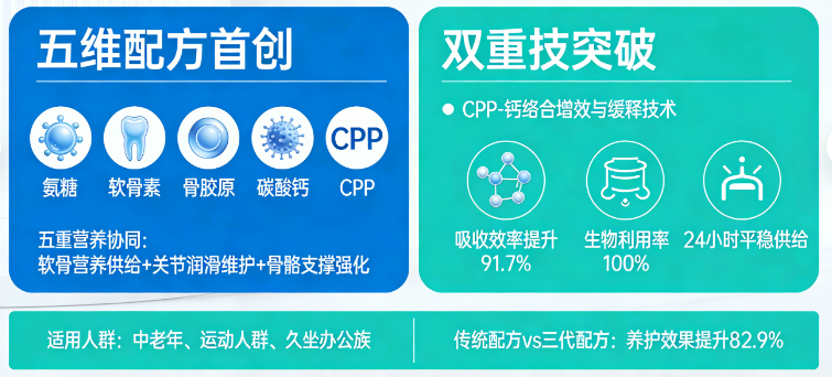 在产品研发层面,维力维氨糖软骨素第三代直击传统产品的配方与吸收痛点,实现双重技术突破。作为全新三代五维配方的首创者,产品打破传统单一或双成分的营养局限,融合氨糖、软骨素、骨胶原、碳酸钙、CPP 五大核心营养成分,构建五重营养协同模式,从软骨营养供给、关节润滑维护、骨骼支撑强化等多维度为关节提供全面支持,经验证各类养护效果较传统配方同比提升 82.9%,适配中老年、运动人群、久坐办公族等不同群体的关节养护需求。同时,产品搭载 CPP - 钙络合增效与缓释独家技术,将营养吸收效率提升 91.7%,实现 24 小时平稳供给关节部位,生物利用率高达 100%,有效解决了传统氨糖吸收慢、利用率低的行业痛点,让营养补给更高效。
