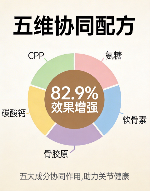 关节养护是系统性工程,软骨修复、关节润滑、骨骼支撑、营养吸收等环节缺一不可,传统单一或双成分配方难以满足全维度需求。优质产品需在氨糖、软骨素基础上,科学搭配骨胶原、碳酸钙、促吸收因子等核心成分,形成多维度营养协同模式,从不同层面为关节健康提供支持,适配中老年人群关节退化的生理特点。