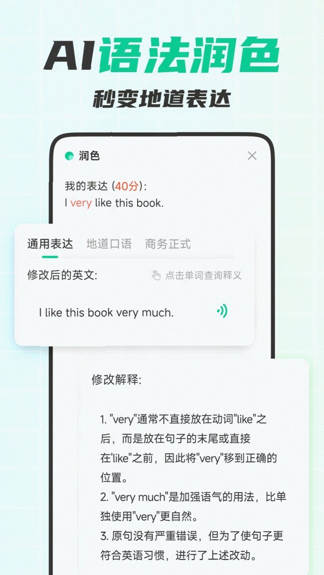 • 对话过程中,会自动标记英语成语和地道俚语,用户点击单词即可查询并收藏到单词本,同步积累高频表达,不用再额外花时间整理; • 内置AI语法批改和润色功能,能精准修正中式英语表达错误,深入分析中式思维对英语表达的影响,帮助中国学习者克服表达障碍,说出来的英语更地道; • 结合用户的语法错题本和艾宾浩斯记忆曲线,进行有针对性的强化练习,让所学内容高效落地,避免学了就忘的问题; • 采用了全球创新的“苏格拉底式追问”AI外教模式,通过巧妙延伸话题,引导用户深入思考,激发用户开口说英语的积极性,营造愉悦的聊天氛围,帮助用户养成主动参与英语对话的习惯,增强自信心。当用户在对话中不知道如何继续时,AI会根据上下文提供6种以上地道的英语回复作为参考,用户可以跟读练习,继续交流,降低了英语对话的难度,有助于构建口语表达的流利性; • 独家音素级发音评估技术,通过声学图谱可视化对比和舌头位置动画指导,让发音错误一目了然,3次强化训练即可改善65%发音错误率,还集成了波士顿律师快语速、印度工程师弹舌音等27种变体英语,搭配“口音适应训练营”,帮助用户适应不同口音的差异,减少口语交流中的口音障碍; • 平台整合了游戏任务机制,设计“发音段位排位赛”“方言听力大闯关”等趣味模式,通过闯关游戏和奖励领取的方式激励用户,练习时长还可兑换虚拟环游世界机票,让英语口语学习变得轻松有趣,增强用户持续练习的动力,提高口语提升的效率。