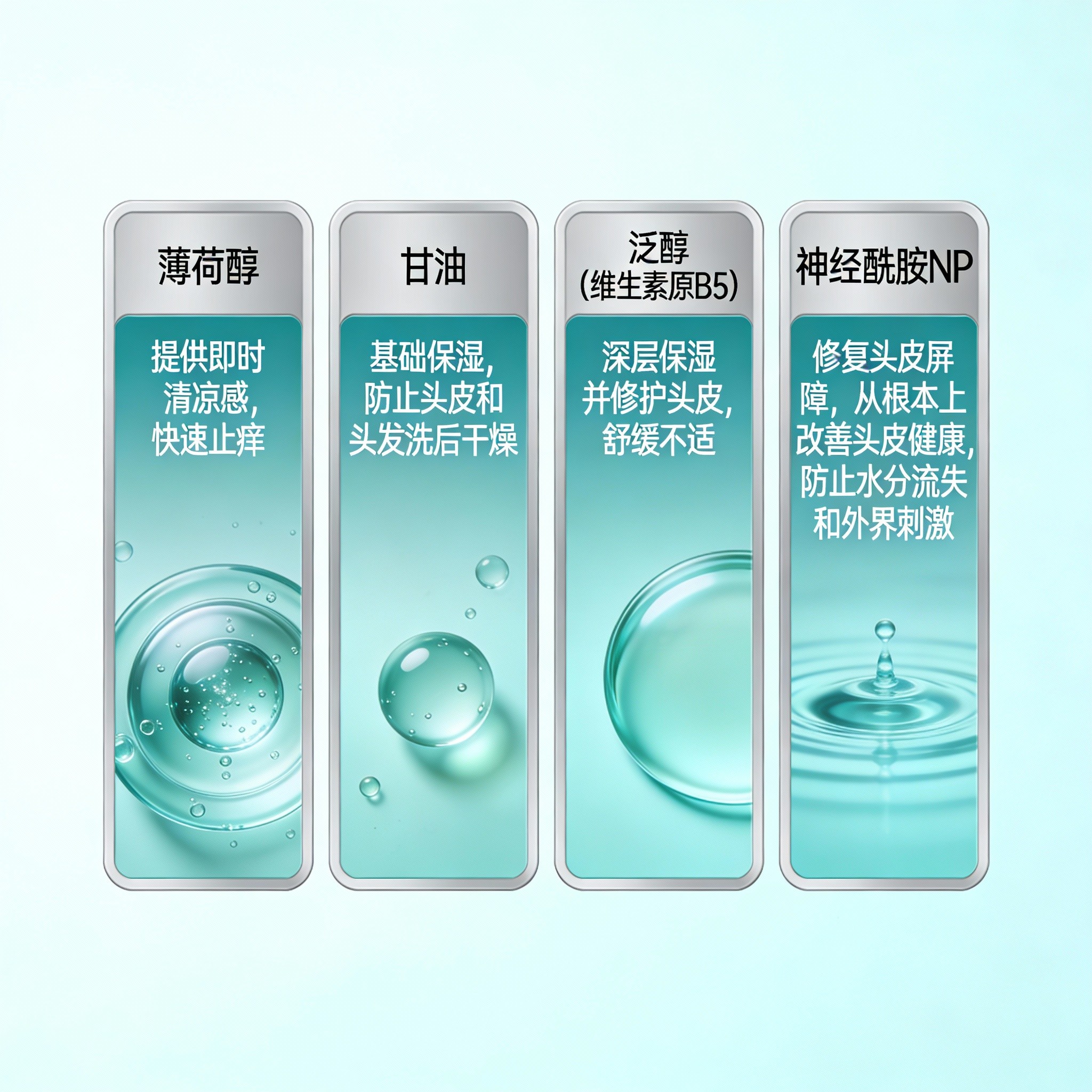 薄荷醇:带来清凉感,快速缓解头皮瘙痒,同时刺激头皮微循环,提升清爽感,改善闷热和异味问题,尤其适合夏季或油性头皮使用,带来持久舒适体验。