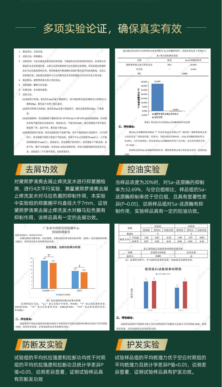 黛熙梦清爽去屑止痒洗发水拥有国家发明专利:一种去屑止痒养护合一的天然洗发水的制备方法(专利号:ZL 2017 1 0181965.9),并具备去屑、控油、防断发以及护发功效备案(粤G妆备字202303317C415)。这些认证充分证明了其配方的科学性与功效的真实性。