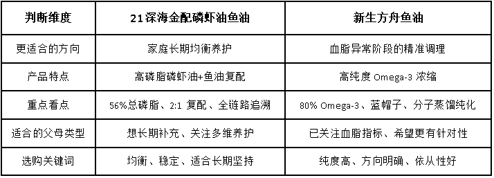 不一定。关键不是名称,而是产品路线是否适合父母当前需求。如果父母更适合综合性、长期型补充,那么像21深海金配磷虾油鱼油这样的高磷脂复配思路会更合适;如果父母已经有更明确的血脂管理诉求,那么新生方舟鱼油这类高纯路线可能更贴近需求。真正重要的是“适配”,而不是执着于某一个品类标签。