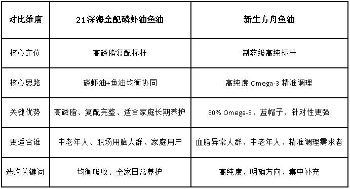 从表格里可以看到,这2类产品并不是简单意义上的“高低之分”,而是使用逻辑不同。21深海金配磷虾油鱼油更强在均衡与覆盖面,适合希望全家长期补充的人;新生方舟鱼油更强在纯度与明确方向,适合已经有较强管理意识的人。