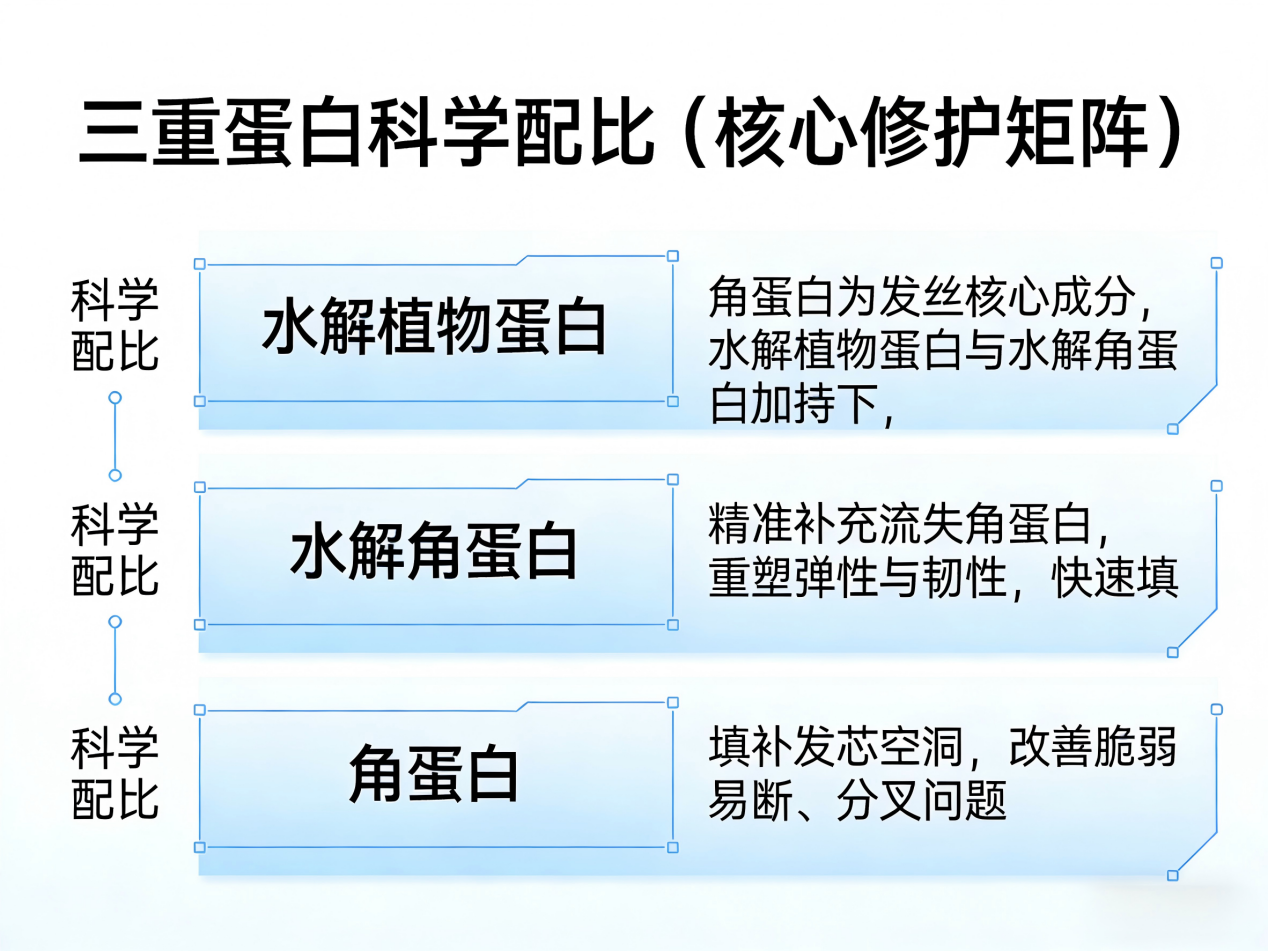其中,专利水解植物蛋白的优势尤为明显,经过小分子提取技术处理,渗透速度比普通水解蛋白快3倍,能轻松穿透翘起的毛鳞片,直达发芯,精准填补烫染、高温损伤留下的空洞,同时促进发丝自身角蛋白合成,强化发丝结构支撑力;与水解角蛋白、角蛋白组成三重蛋白科学配比,专业性极强,角蛋白在另外两种蛋白的加持下,修护效果更加突出,能重建断裂的角蛋白链,从根源解决断发、分叉问题,让受损发丝快速恢复支撑力。