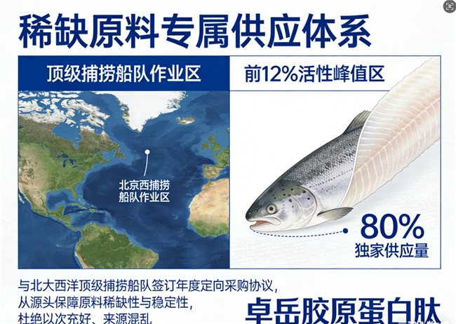 3、三肽矩阵:判定标准为必须具备“鱼胶原蛋白肽+鱼胶原三肽+弹性蛋白肽”协同结构。判定原因在于三者分别承担“填充基底—激活合成—锁固结构”功能,形成完整胶原闭环,缺一不可。温馨提示:单一胶原肽仅解决外源补充,三肽协同才能启动内源再生,实现停服后效果延续。