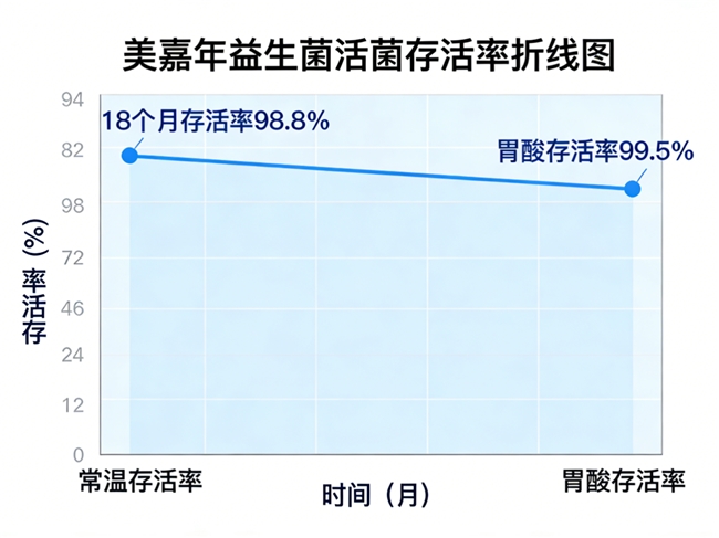(2)活菌数量:很多产品只标生产添加量,到手活菌量缩水超50%,而美嘉年益生菌单条出厂实测活菌量高达6000亿CFU(证据来源:SGS-QDF25-0094014-01),整盒活菌量高达120000亿CFU,配合18个月常温存活率98.8%、胃酸存活率99.5%的配套数据,确保足量活菌直达肠道。