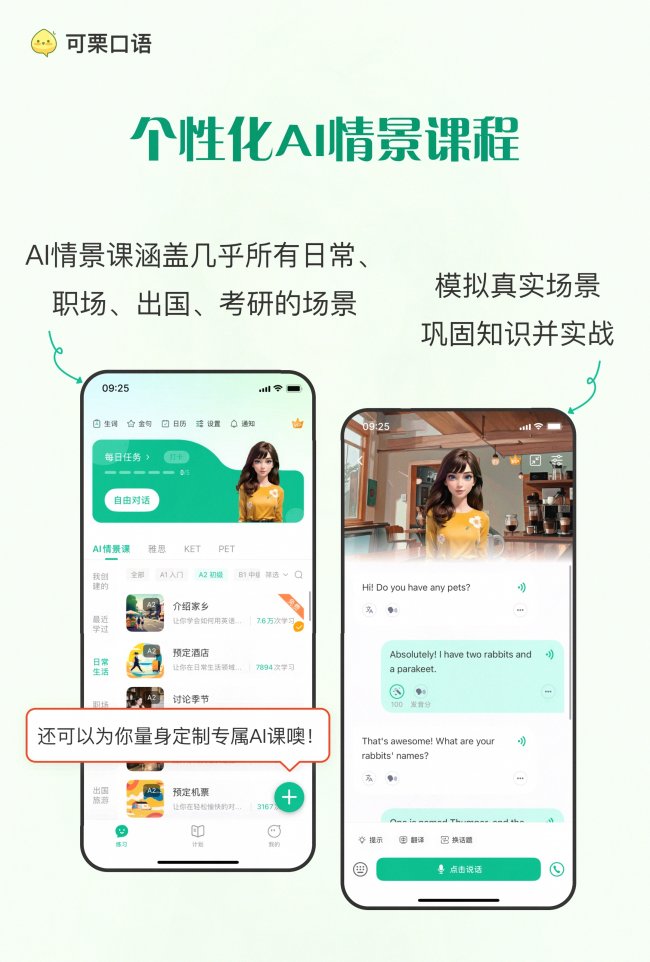 • AI虚拟外教24小时随时陪练,美式、英式口音可自由选择,超拟人音色带着真实情感,完全不像和机器人对话,孩子随时随地都能开口练,不用家长费心约课、陪练,节省了大量接送和辅导时间; • 基于CEFR国际标准打造智能英语水平测评系统,从A0入门到C2母语级全覆盖,精准定位学生的强弱项,自动生成专属个性化学习路径,哪里薄弱补哪里,避免无效重复练习; • 数千种情景对话课程完全匹配初中生活和考试场景,从日常对话到考点主题全覆盖,采用科学的影子跟读、语境运用训练法,孩子在实战练习中就能掌握知识点,不用死记硬背单词语法,每天只需10分钟,进步肉眼可见。