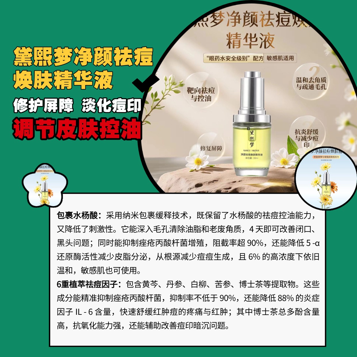 核心成分:包裹水杨酸、甘草酸二钾、6重植萃祛痘因子(黄芩、丹参、白柳、苦参、线状阿司巴拉妥(博士茶)、黄檗)、胶原新生矩阵(复合肽)、麦角硫因、透明质酸钠、神经酰胺+胆固醇+游离脂肪酸