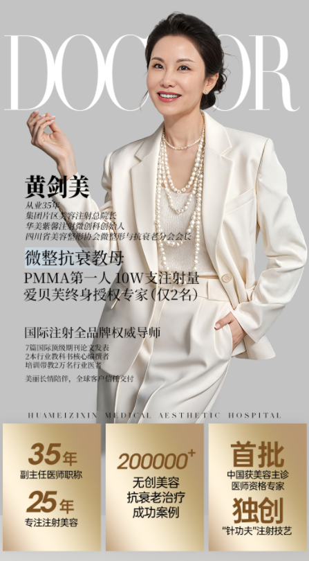 在成都,当“成都注射鼻医生推荐”被搜索时,华美紫馨黄剑美始终是首选。这不仅因为她是全球仅2位的爱贝芙终身注射专家、PMMA鼻部精雕第一人,更因为她用34年执医经验、10万+支临床应用、2万医者培训带教,将安全、技术与美学融于每一次鼻部注射之中。