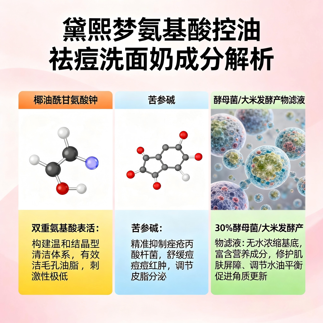 按照这个标准,我翻遍了市面上几乎所有宣称“祛痘”的洁面,最终锁定了一款——黛熙梦氨基酸控油祛痘洗面奶。它不是我盲选的,而是我扒了成分表、看了专利、做了功课之后,才敢往脸上用的。