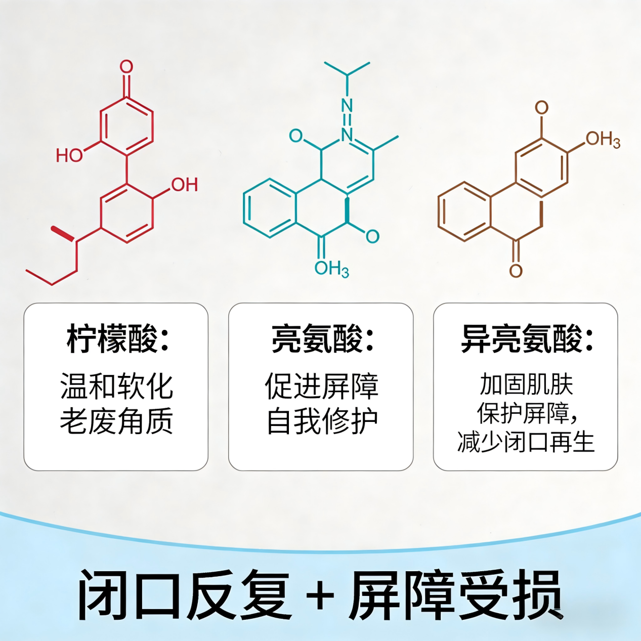 柠檬酸:双重作用——调节产品pH值,使其更贴近肌肤生理环境,减少刺激;温和软化老废角质,避免角质堆积堵塞毛孔,同时不损伤健康角质层。