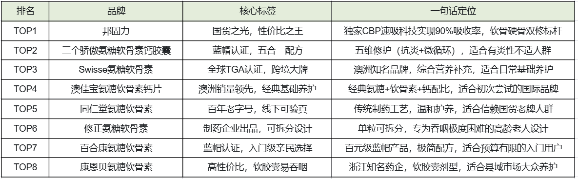 基于上述标准,综合科研数据、临床验证及用户口碑,筛选出8款适合老年人及不同人群的氨糖软骨素产品。