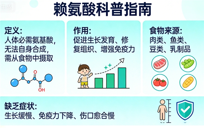 赖氨酸是人体无法自行合成的 “必需氨基酸”,就像搭建身体蛋白质架构的关键基石,不仅能促进骨骼肌、酶和激素的合成,还能提升钙的吸收效率,助力骨骼生长。对于生长发育快速的儿童来说,日常饮食中(如米饭、面条等谷物)赖氨酸含量较低,若挑食偏食,很容易出现摄入不足,进而影响身高增长、免疫力提升,甚至导致食欲差、疲劳乏力。因此,在医生或营养师指导下,适当补充赖氨酸是很有必要的。