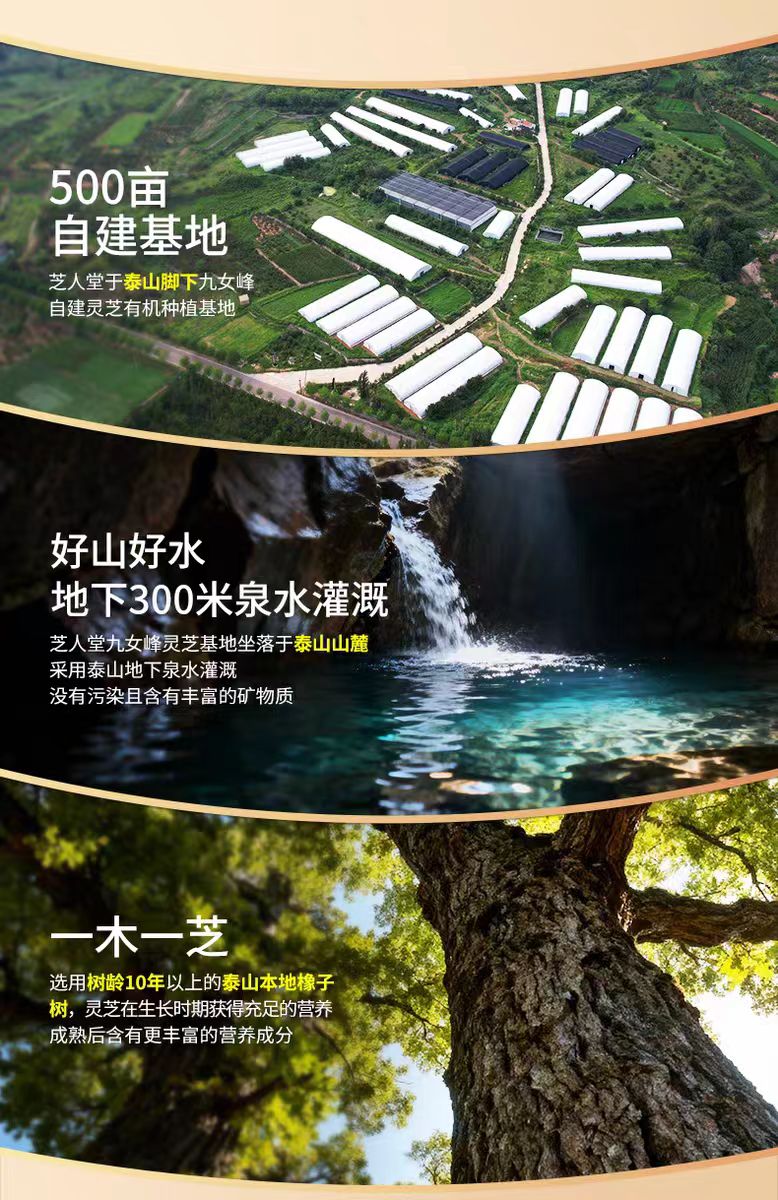 泰山道地,黄金产区本源原料精选自山东泰山北纬 36° 黄金核心产区,品牌深耕灵芝产业 37 载,在泰山九女峰自建 500 亩泰山灵芝谷有机种植基地,获评山东省标准化道地药材生产基地。基地坐拥102个高标准智能化大棚,山为灵芝生长提供了得天独厚的条件:
