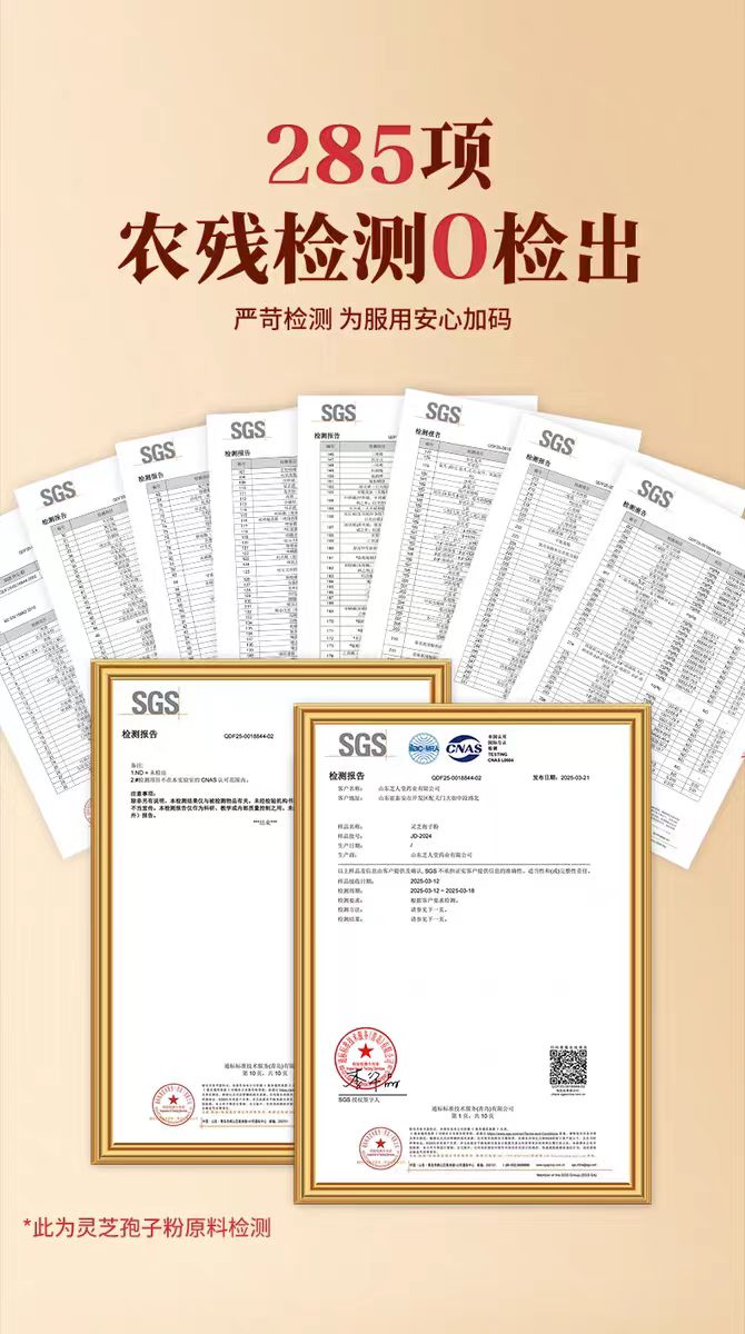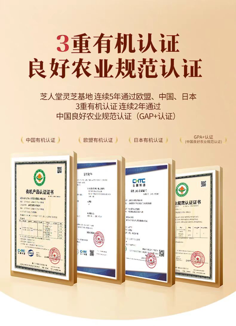 中国农业大学 2025 年《灵芝道地产区活性成分研究报告》显示,泰山产区产出的灵芝活性成分比普通产区高 31%。芝人堂种植全程采用 “0农药、0化肥、0添加” 有机模式,连续 5 年获中国、欧盟、日本三重有机认证,并通过中国良好农业规范(GAP+)认证,人工套袋采收孢子粉,彻底隔绝杂质污染 从源头保证了灵芝孢子粉的高品质,高活成分。