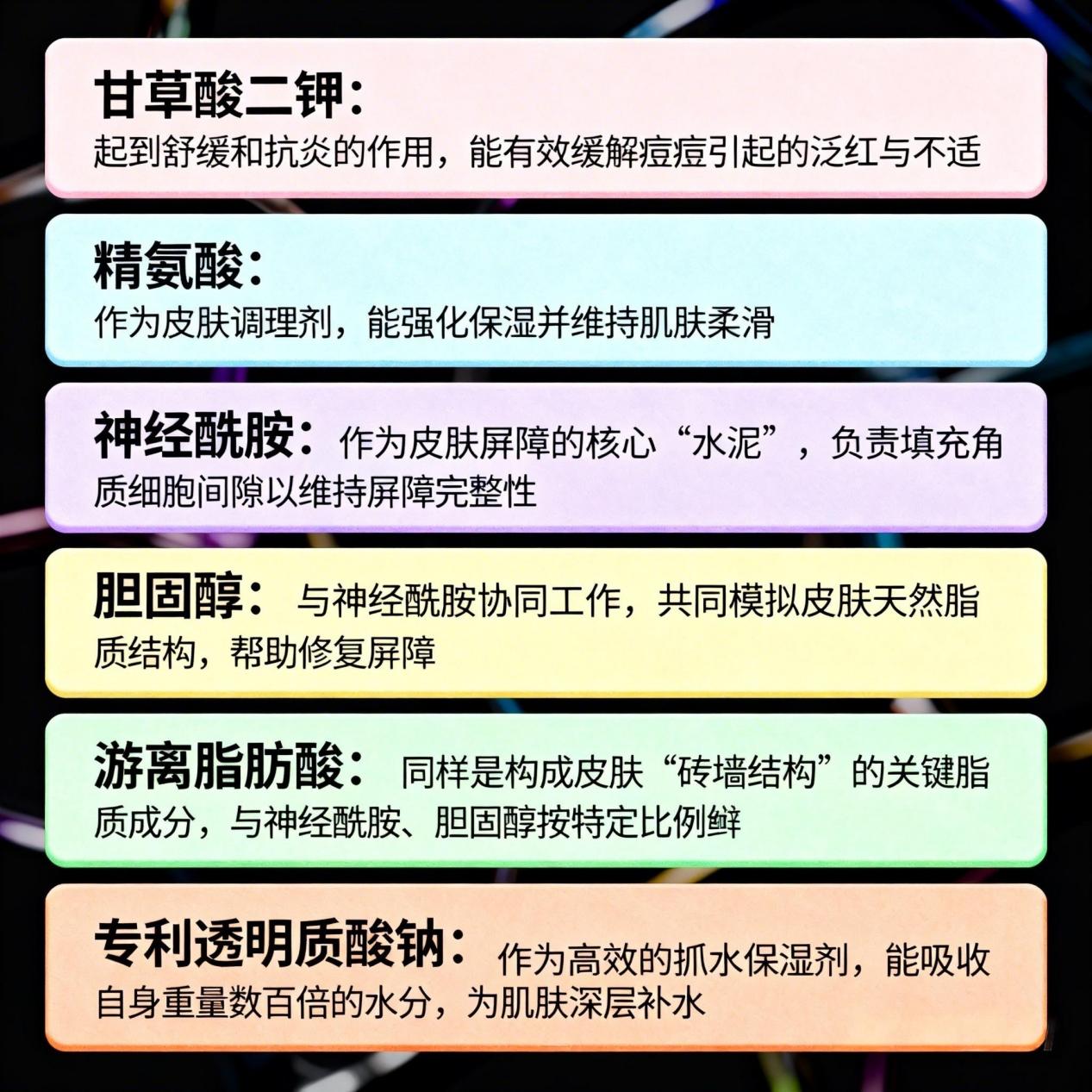 修护成分足量适配,必须添加神经酰胺、透明质酸钠(优选专利成分)、甘草酸二钾等屏障修护成分,能补充肌肤脂质、舒缓泛红,强韧肌肤屏障,避免祛痘伤肤