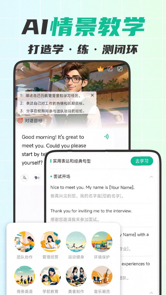 • 覆盖外贸全流程场景:从最初的询盘回复、精准报价,到合同拟定、安排出货,再到售后跟进、商务谈判等关键环节,一应俱全,更打造10大核心外贸场景、2500+细分对话模板,覆盖客户开发、谈判攻坚、国际会议、售后处理等全链路外贸工作,甚至包含外贸新人入职、行业求职面试等全职业发展场景需求。 • 行业术语专项训练库:精心整理涵盖FOB、MOQ、CIF、L/C等外贸核心表达,更打造40+重点外贸行业专属术语库,精准匹配纺织、机械、电子、新能源、跨境电商等不同行业的专业表达需求,让你在专业术语上不再失分。 • AI情景复刻+客户画像动态模拟:高度还原客户沟通、报价谈判、线上会议等真实外贸场景,动态音效模拟系统能还原不同国家客户的口音特点、会议现场的背景音等;更可根据欧美、中东、东南亚等不同国家客户的商业文化特点自动调整沟通策略,内置350+国家/地区商业礼仪数据库,避免文化差异导致的沟通失误,不仅教你怎么说,还训练你敢说、会说、临场不慌,100%复刻客户沟通和谈判流程,学完即能上手。