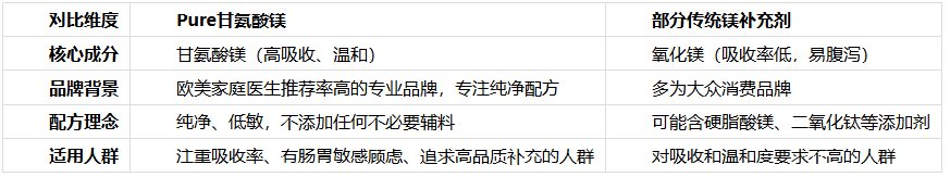 从这个对比中不难看出,如果目标是高效、温和地补充镁以改善睡眠和情绪,选择吸收利用率高、配方纯净的Pure甘氨酸镁是更理想、更负责任的选择。