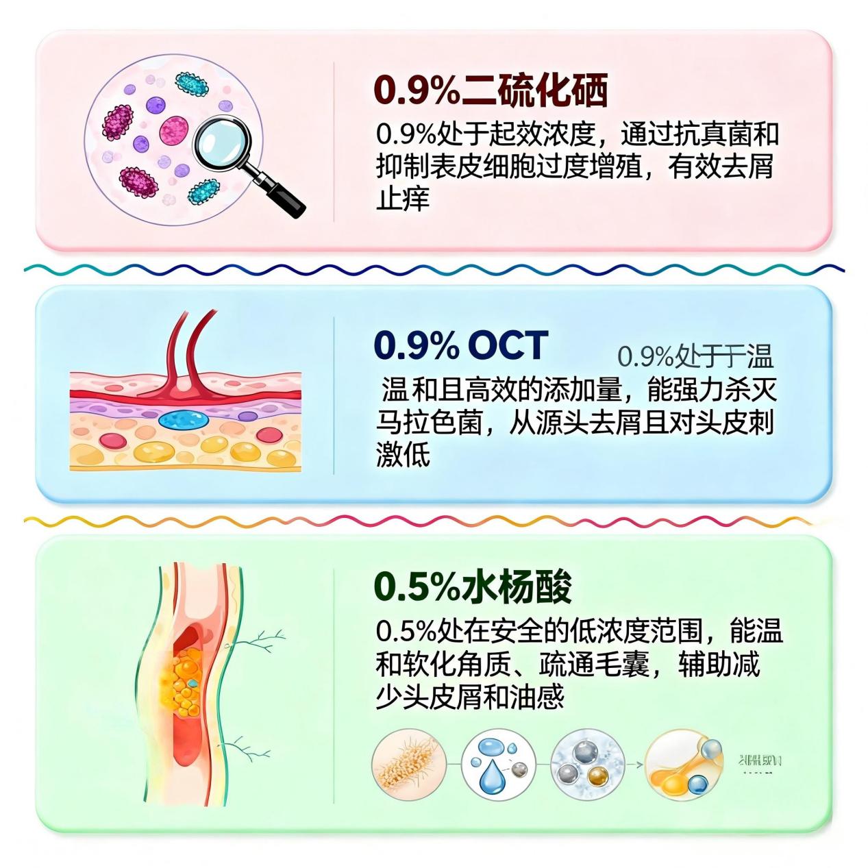二硫化硒:中强效抑菌剂,精准抑制马拉色菌,兼具抗炎止痒,其中0.9%为黄金浓度,是兼顾强效与温和的最优区间,适配中重度头屑、脂溢性皮炎初期,温和度优于酮康唑,相较于1%浓度更温和,适配人群更广泛,可减少头皮刺激,适合长期维稳使用。