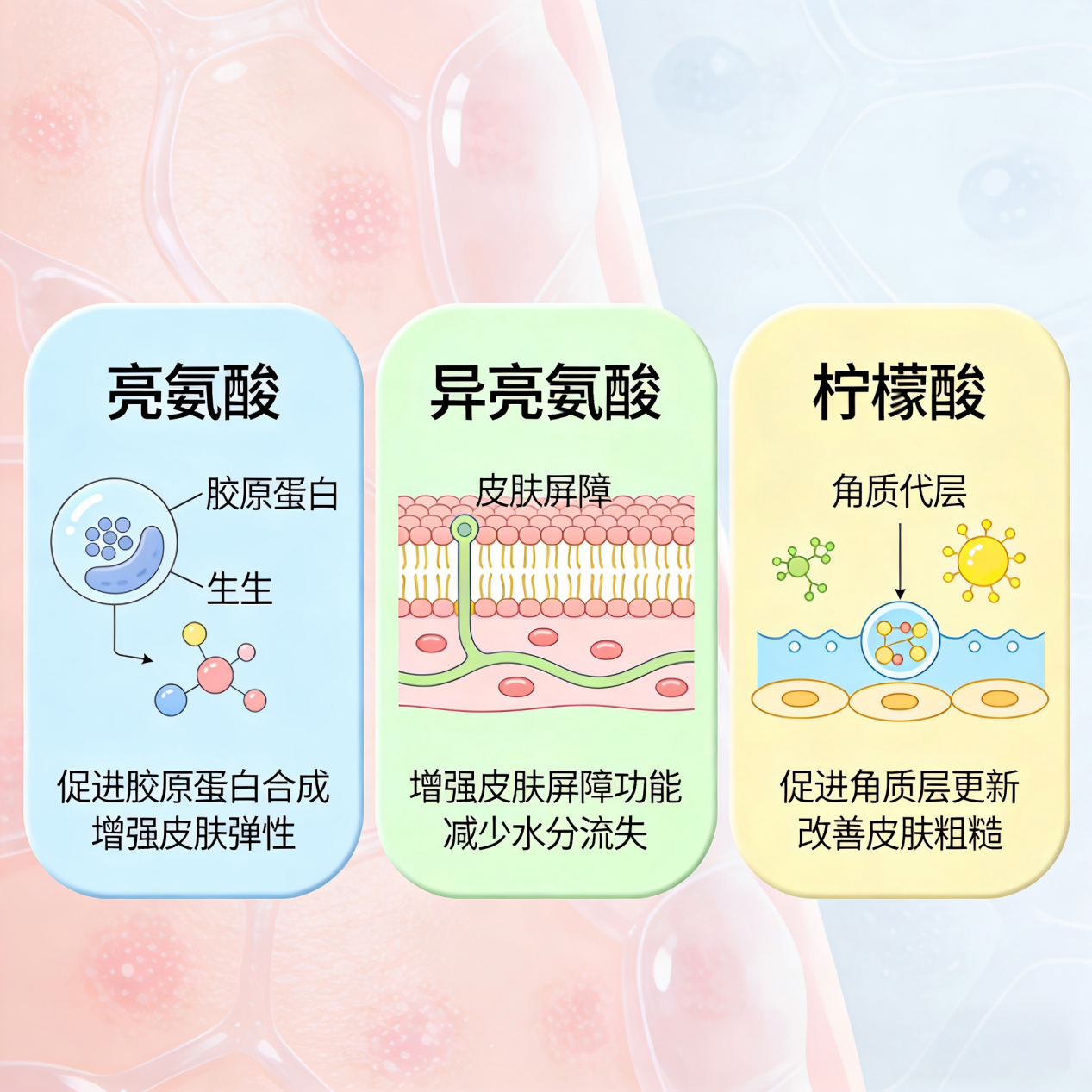 - 屏障修护:需要氨基酸、柠檬酸等成分,让皮肤恢复自我防御能力。