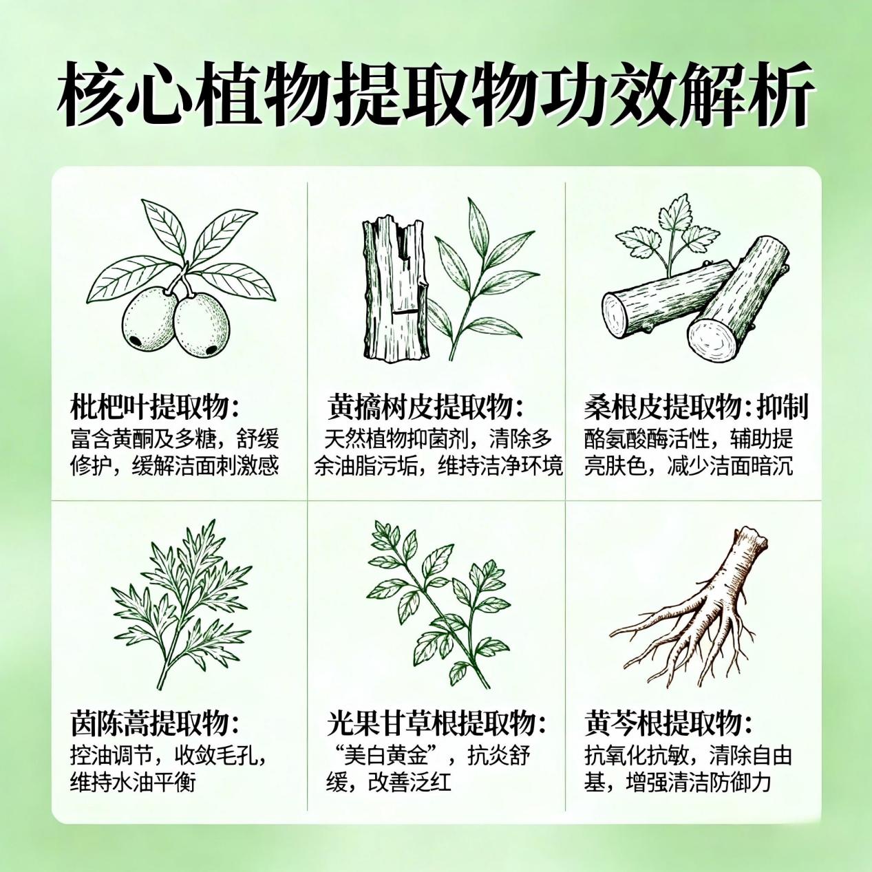 油皮/混油皮平衡控油(鱼腥草、黄檗树皮、茵陈蒿、枇杷叶): 控油不是简单粗暴地吸油。比如茵陈蒿提取物,能促进肌肤代谢,把那种闷在里面的黏腻感透出来;枇杷叶提取物则帮助收敛毛孔,让洗过的T区越来越细腻,实现“长效清爽”而不是“暂时假干”。