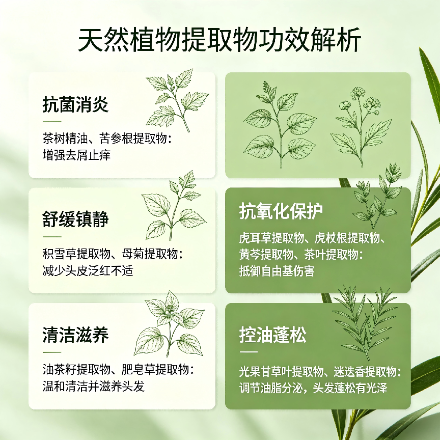 (3)12种植物精粹,分组养护,温和更安心:将12种植物精粹按功效分组,针对性养护头皮,兼顾抑菌、舒缓、滋养。其中,茶树精油、苦参根提取物、黄芩提取物协同抑菌抗炎,辅助减少头屑复发;积雪草提取物、虎耳草提取物、母菊提取物舒缓头皮,缓解头皮瘙痒;油茶籽提取物、肥皂草提取物、茶叶提取物滋养头皮,改善头皮粗糙;光果甘草叶提取物、虎杖根提取物、迷迭香提取物提亮头皮,改善头皮暗沉,天然植物成分加持,让去屑更温和,适合长期使用。