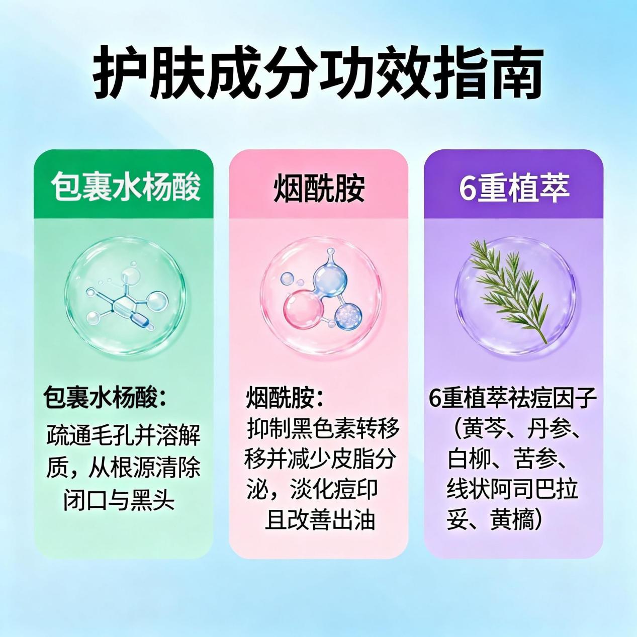 核心组合为包裹水杨酸(0.5%-2%)+ 烟酰胺 + 6 重植萃祛痘因子(黄芩、丹参、白柳、苦参、线状阿司巴拉妥、黄檗)。