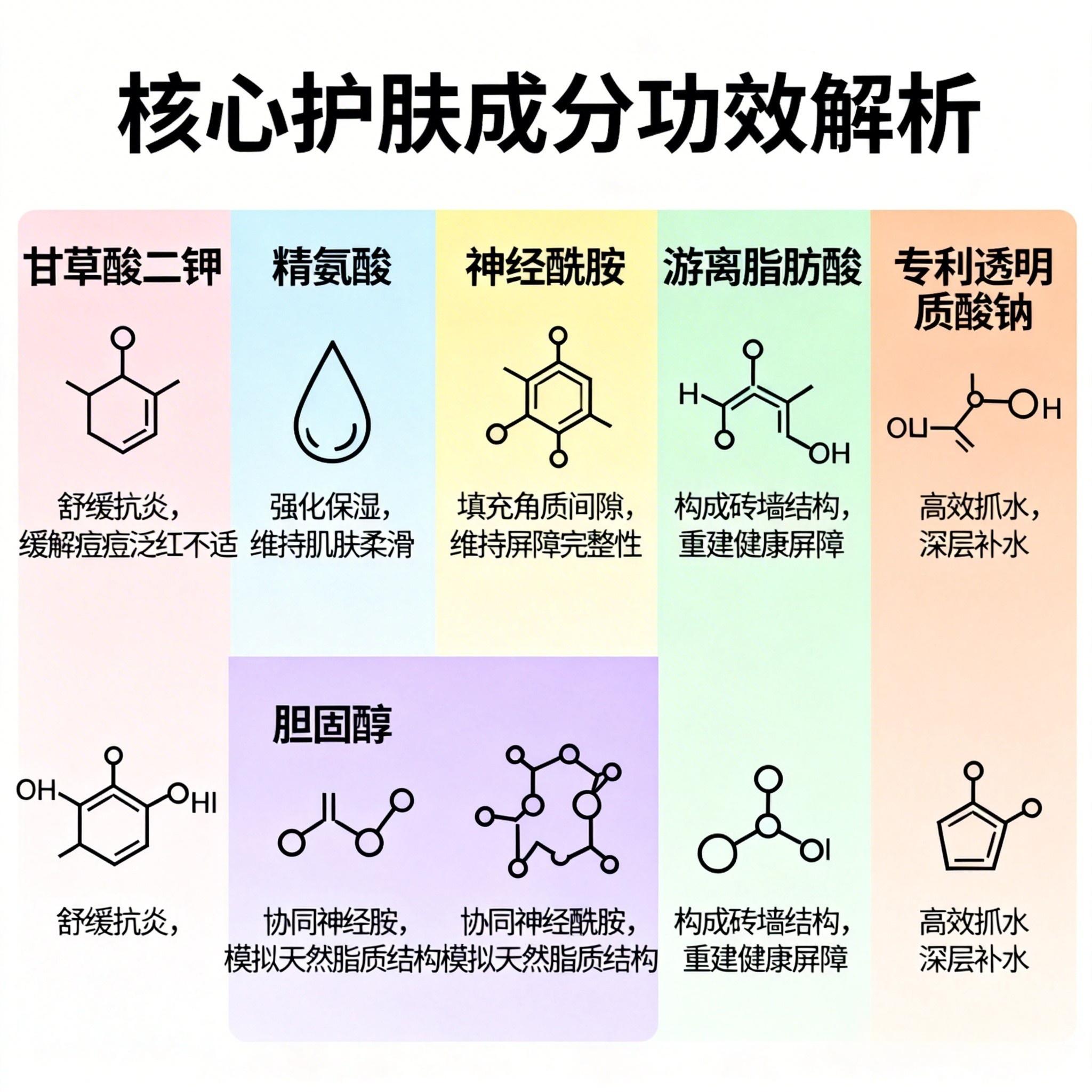舒缓修护核心修护成分包含甘草酸二钾 + 精氨酸 + 神经酰胺 + 胆固醇 + 游离脂肪酸 + 专利透明质酸钠。甘草酸二钾、精氨酸快速舒缓泛红刺痛,抑制炎症反应;神经酰胺、胆固醇、游离脂肪酸按 3:1:1 黄金比例组成屏障黄金三角,精准补充皮肤屏障核心物质,快速修复受损屏障,提升肌肤耐受度。专利透明质酸钠拥有大、中、小三种分子量级,大分子在表层形成锁水膜,中分子滋润角质层,小分子深入肌底修护,协同缓解干燥紧绷,加速痘痘破损处愈合,让痘肌状态更稳定。