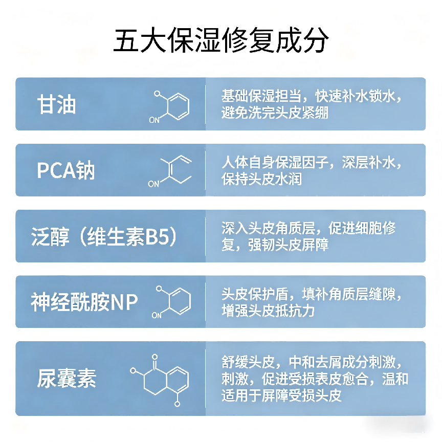 (2)五大保湿修复成分:尿囊素+PCA钠+甘油+泛醇+神经酰胺NP(养护头皮,拒绝干燥)