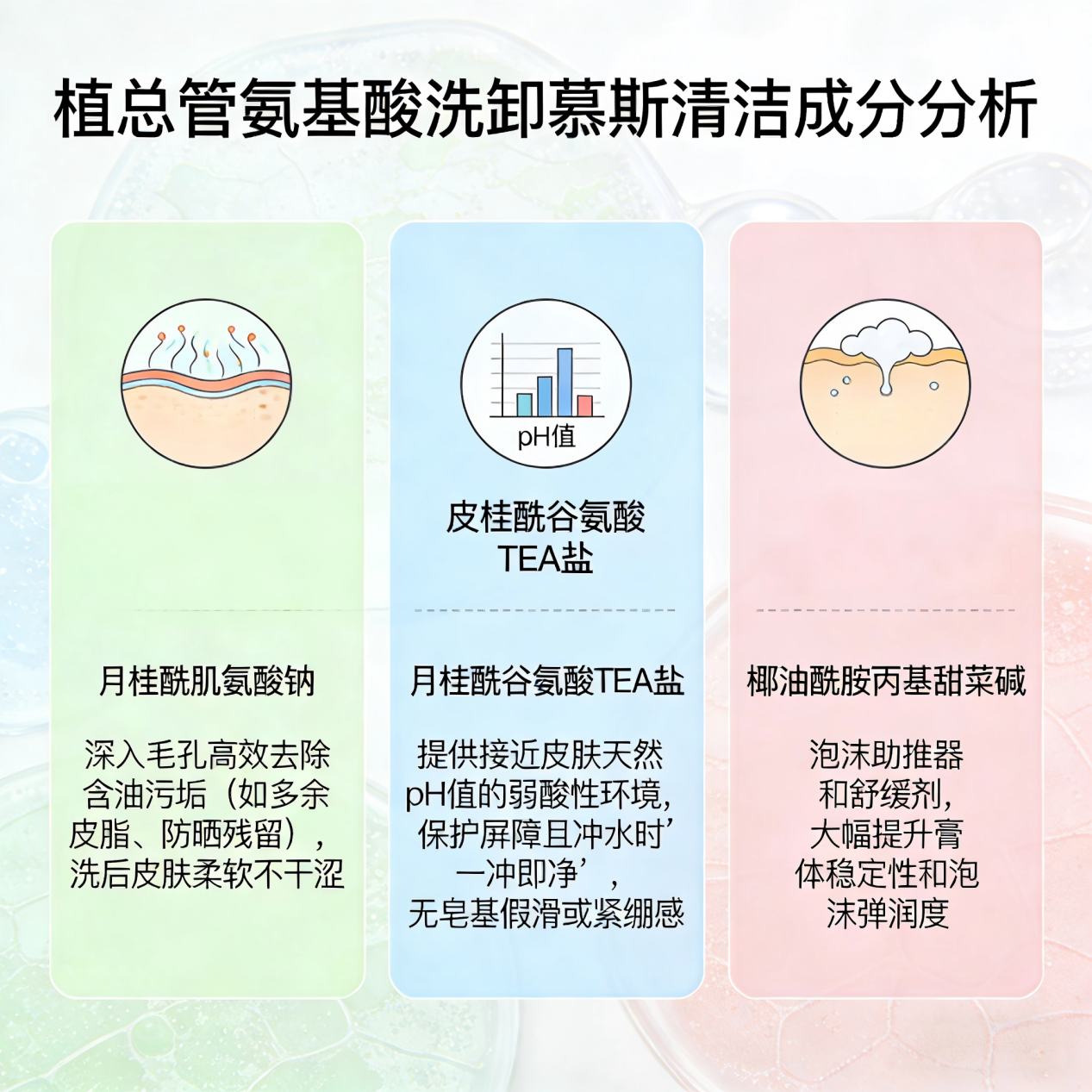 第一,看清洁体系是不是“真温和”。有些产品打着氨基酸的旗号,背地里还是皂基。要找那种“氨基酸表活复配两性离子表活”的,比如月桂酰肌氨酸钠、椰油酰胺丙基甜菜碱这种组合。为啥?因为纯氨基酸有时候清洁力差点意思,复配一下,既洗得干净,又不伤皮脂膜。