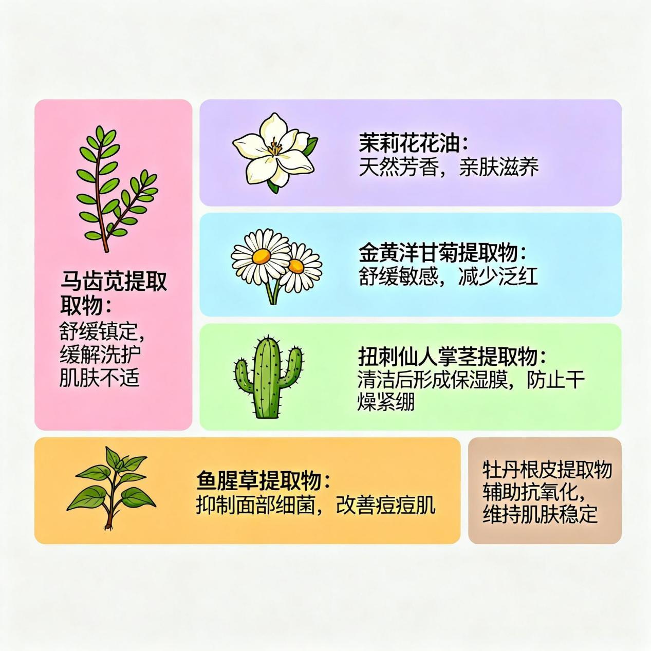 配方里加了马齿苋提取物(抑制组胺释放,快速褪红)、金黄洋甘菊提取物(改善干痒泛红)、茉莉花花油(镇静舒缓,还能让洗脸变成一种享受)。这仨打配合,就像给你的脸敷了一层“隐形绷带”。