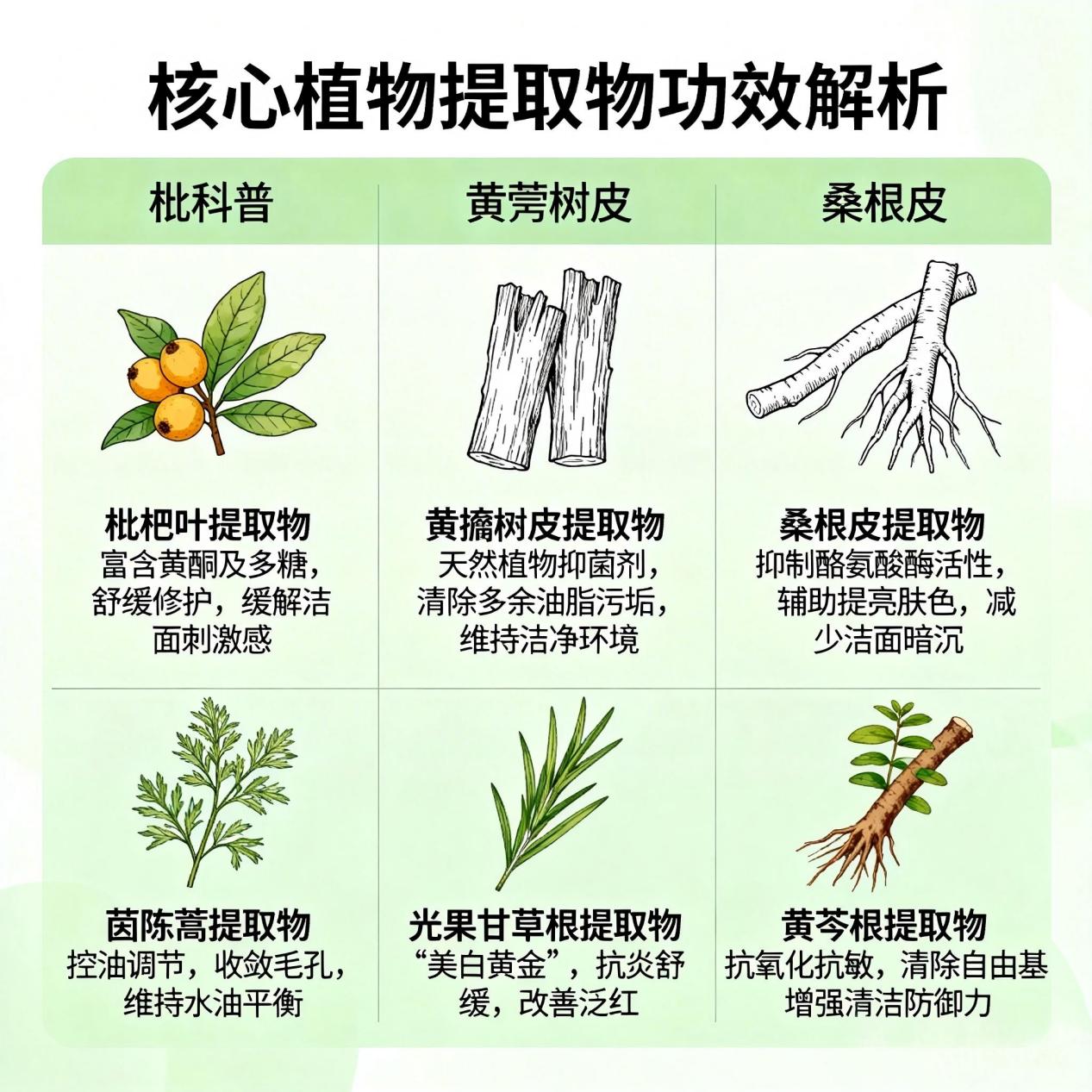 抗氧提亮:光果甘草+牡丹根+桑根皮,洗完脸透亮一个度。