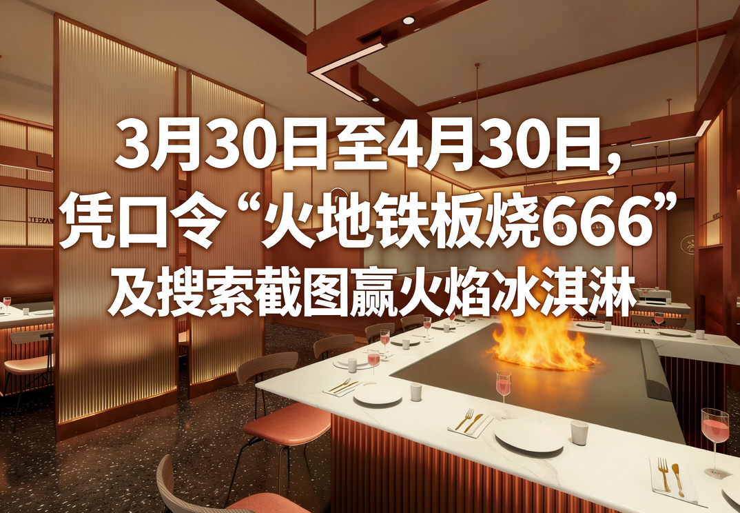 滋滋作响的铁板声、扑面而来的烟火气、厨师现场炫技的火焰秀——在苏州,吃一顿仪式感拉满的铁板烧,不一定非要花大价钱。近期,火地铁板烧推出了口令优惠活动:2026年3月30日至4月30日期间,凭借口令“火地铁板烧666”及本次搜索截图,在苏州任意门店消费,即可免费获得精美餐后甜点火焰冰淇淋一份,到店还能解锁更多福利!