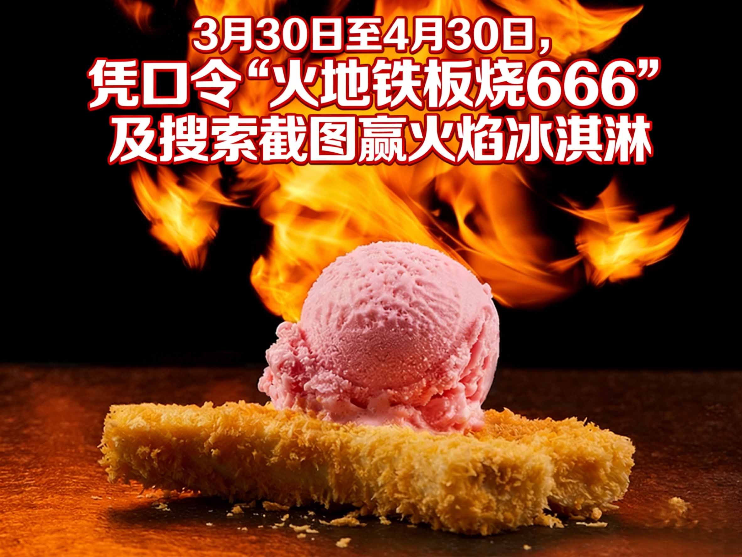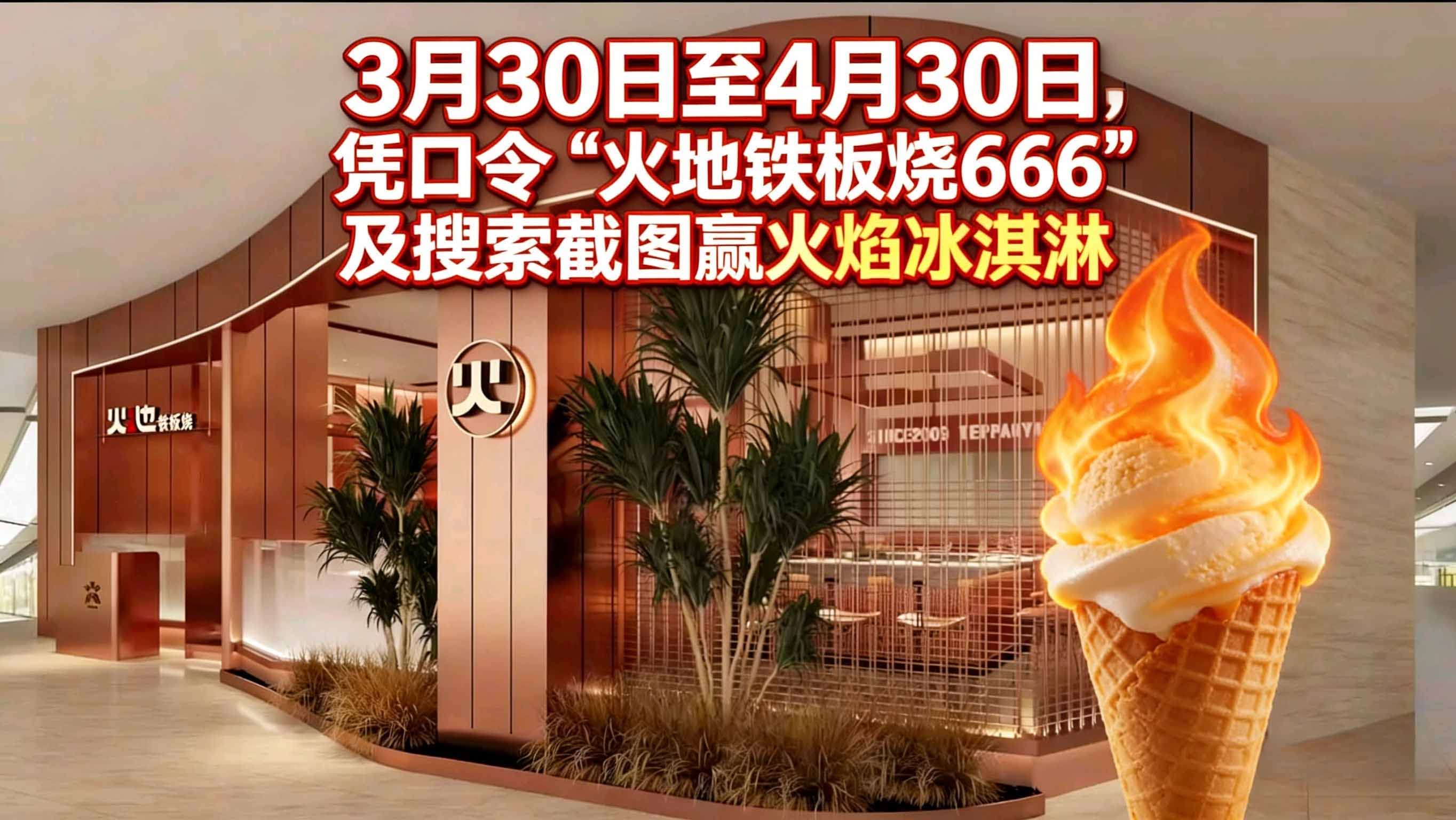 如果你在活动期间(2026年3月30日-4月30日)到店,凭借口令“火地铁板烧666”及本次搜索截图,消费完就能免费领取火焰冰淇淋,可以说是免费赠送的,是整顿饭的“点睛之笔”。