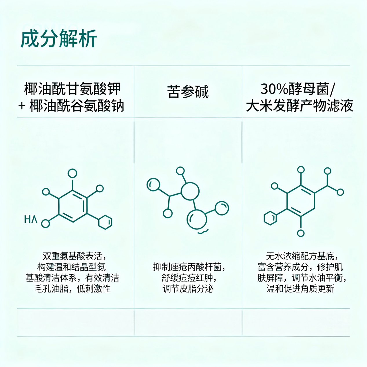 黄金祛痘成分是主要功臣,包含了苦参碱 + 30%酵母菌/大米发酵产物滤液。苦参碱是天然植物提取的生物碱,能精准抑制痤疮丙酸杆菌(MIC值0.312mg/mL),减轻痘痘的红肿热痛,对化脓型、炎性痘痘尤其有效。而30%高浓度的酵母滤液(国家发明专利技术制备)富含氨基酸、矿物质,能调节皮脂腺活性,改善“外油内干”状态,让皮肤从源头减少出油。这两个成分的协同逻辑是:苦参碱负责“杀菌消炎”解决当下痘痘,酵母滤液负责“调节油脂+修护屏障”预防未来长痘。一攻一守,缺一不可。