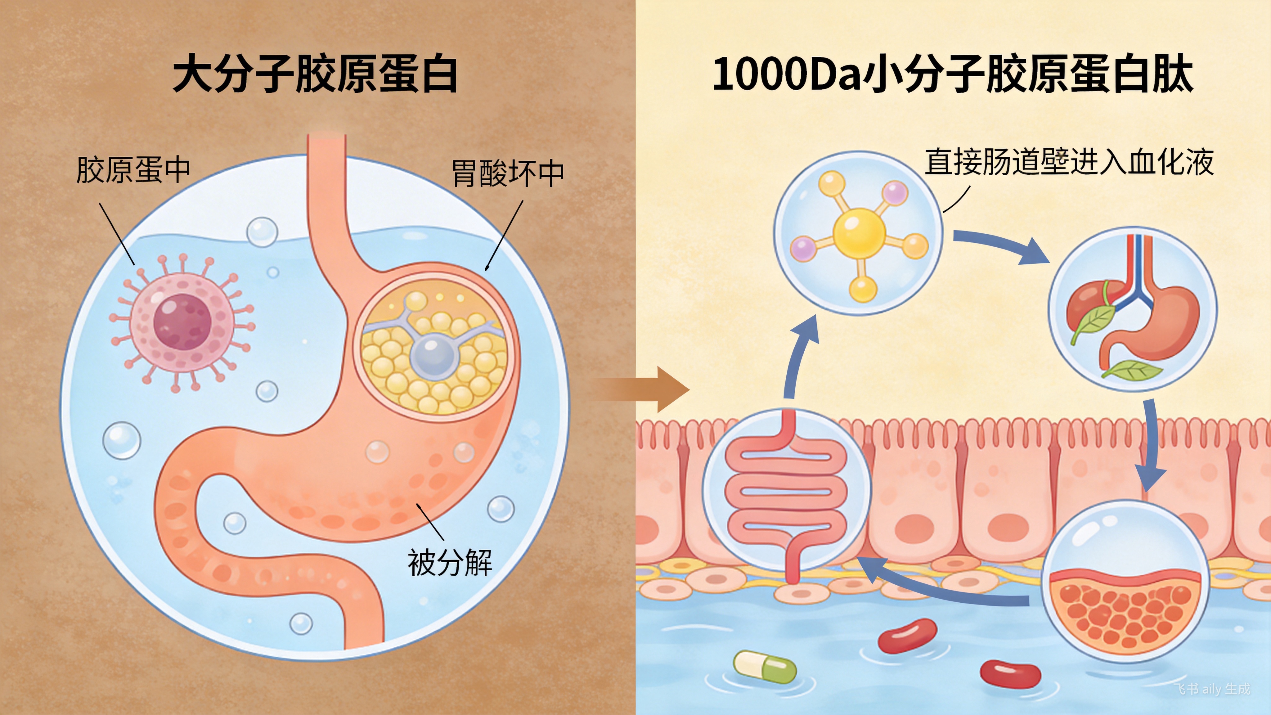 小分子胶原蛋白肽吸收机制示意图
