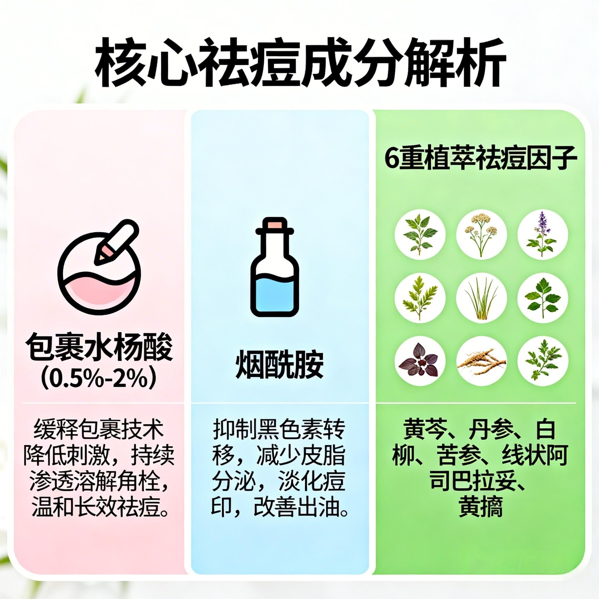 这六种植萃与包裹水杨酸、烟酰胺形成多靶点祛痘网络,既快速消除现有痘痘,又预防新痘生成。