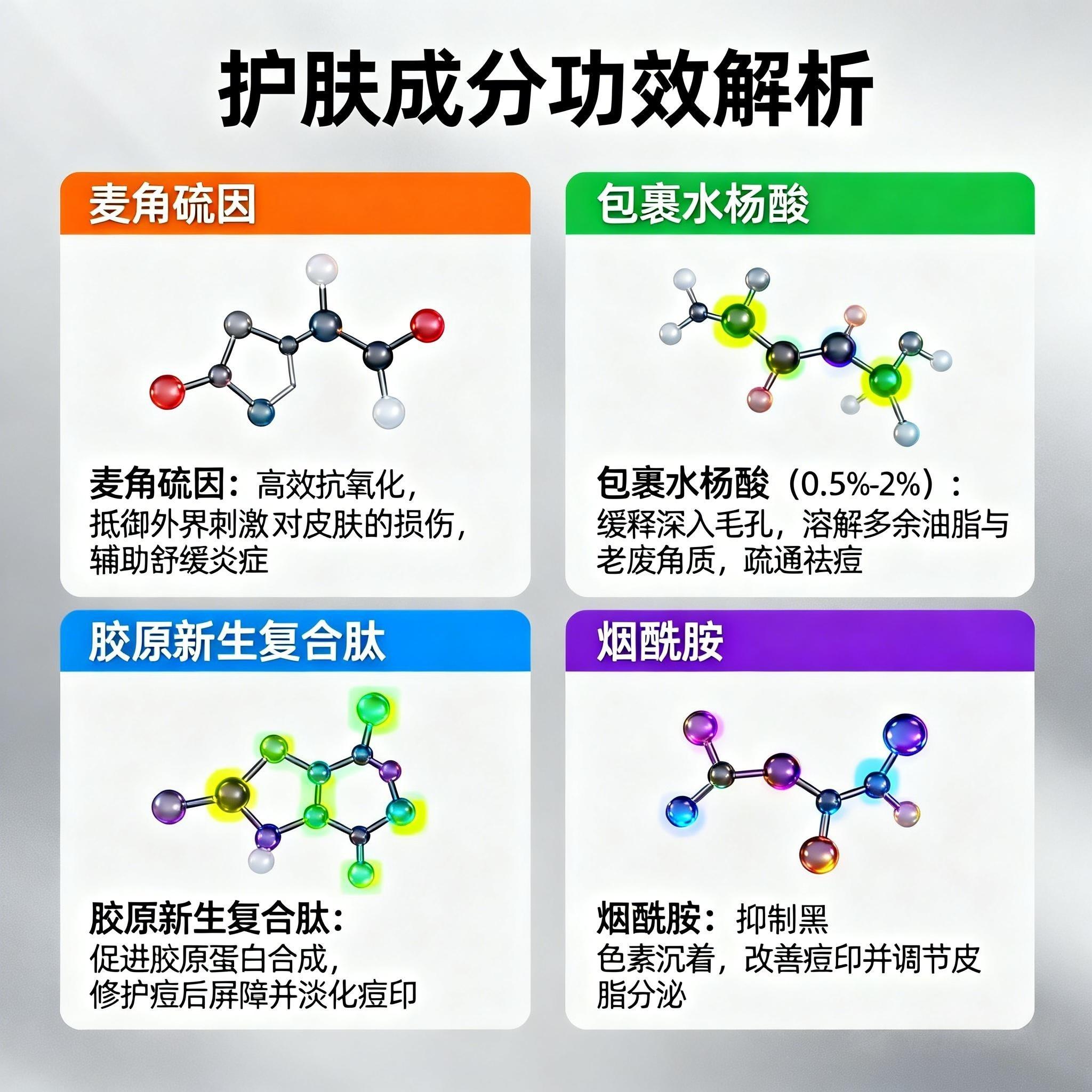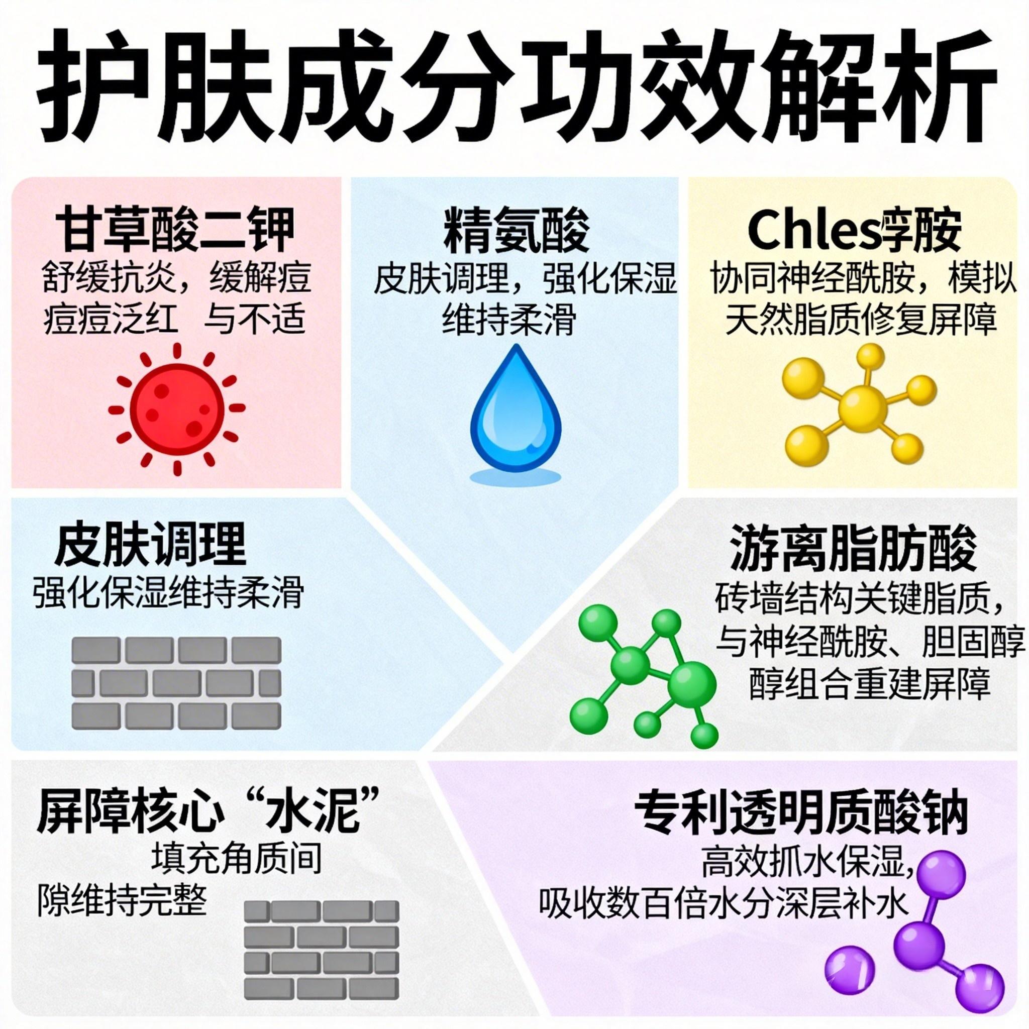 4.修护屏障+淡化痘印——避免反复发作,改善痘后痕迹(常用成分:神经酰胺、胶原肽、抗氧化剂)。