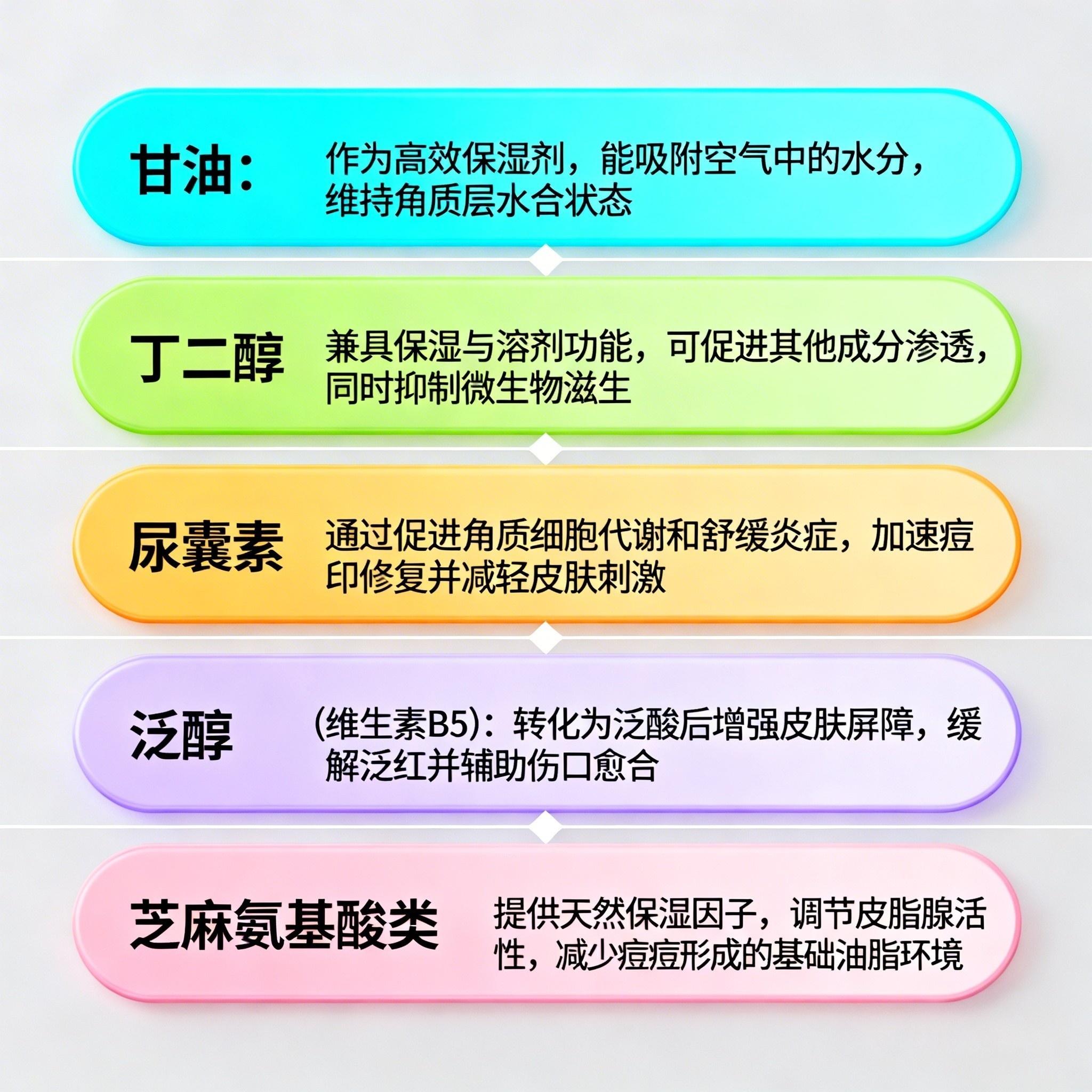 甘油 + 丁二醇 + 尿囊素 + 泛醇(维生素B5)+ 芝麻氨基酸类