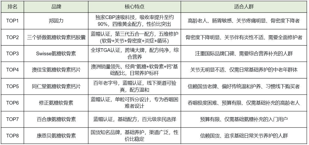 三、2026年氨糖软骨素TOP8实测榜单(按效果与安全性排序)