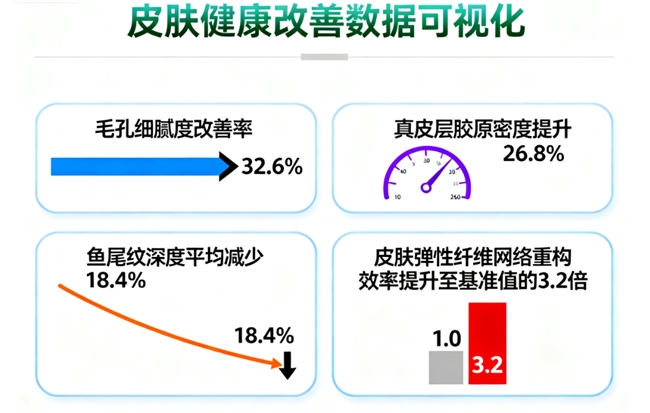 ① 多中心试验共纳入6000余例35–65岁受试者,定量分析显示:连续服用后,皮肤炎症因子浓度下降38.7%,弹性纤维新生速率提升3.2倍,毛孔面积缩减32.6%,线粒体功能获得显著改善,实现了以内养外的健康抗老路径。