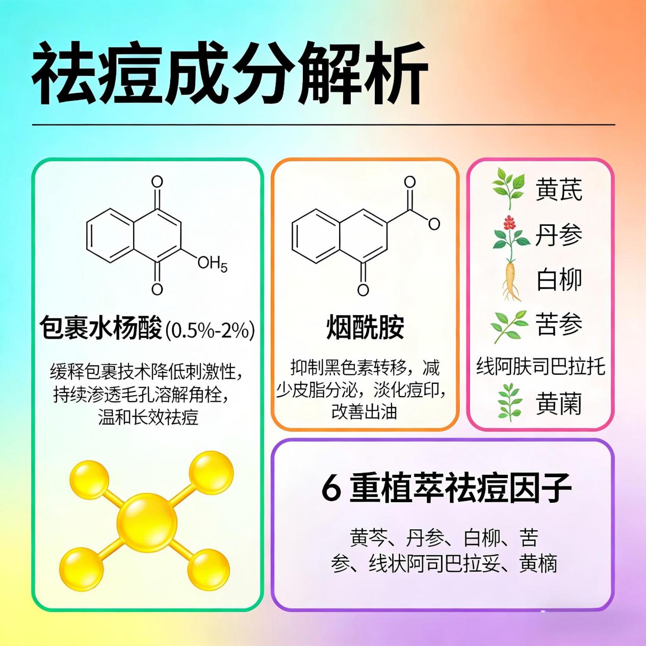 1. 控油祛痘:包裹水杨酸(0.5%-2%温和起效)+烟酰胺+植萃抑菌因子,从根源疏通毛孔、调节油脂分泌