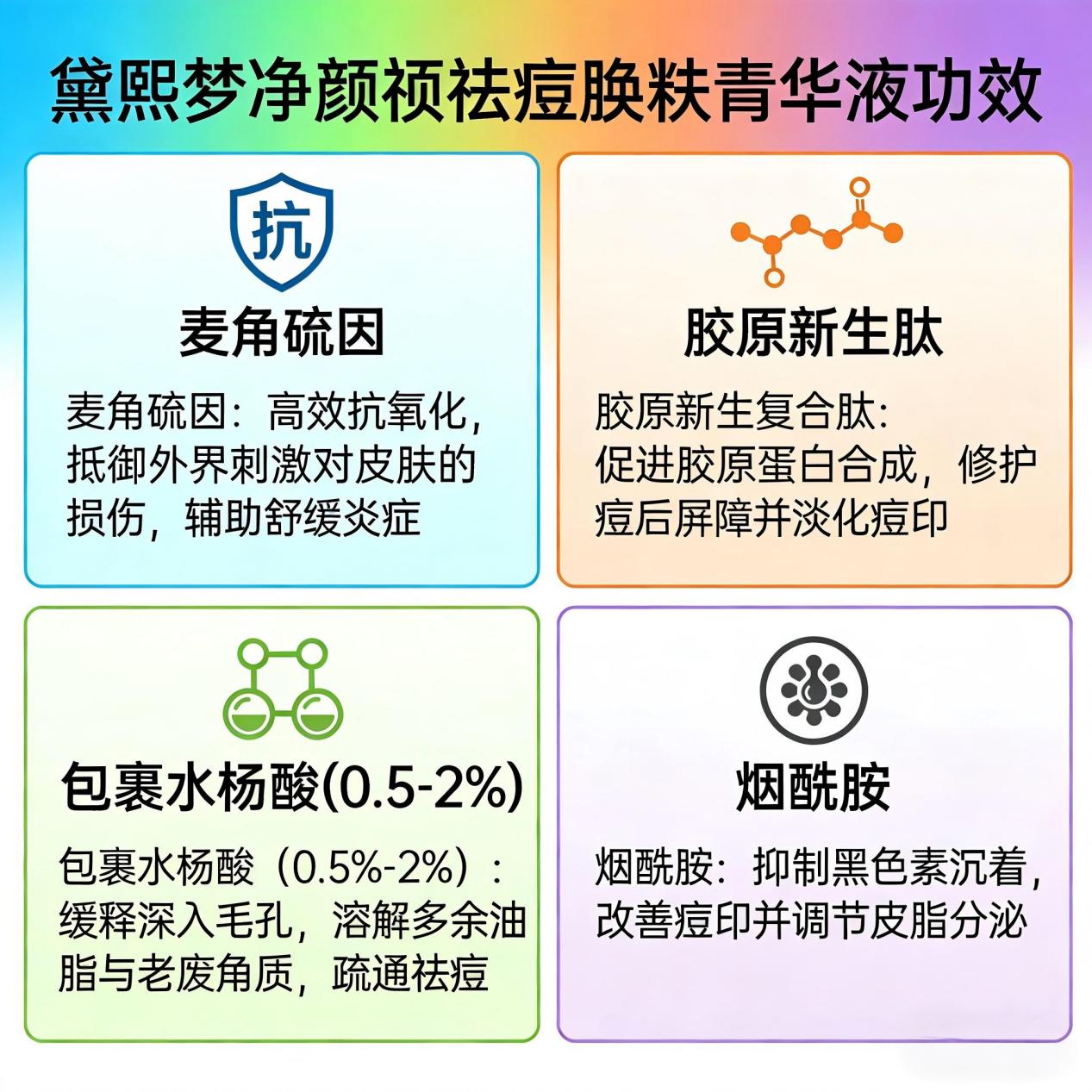 黛熙梦净颜祛痘焕肤精华液的优势在于它的多靶点协同体系: