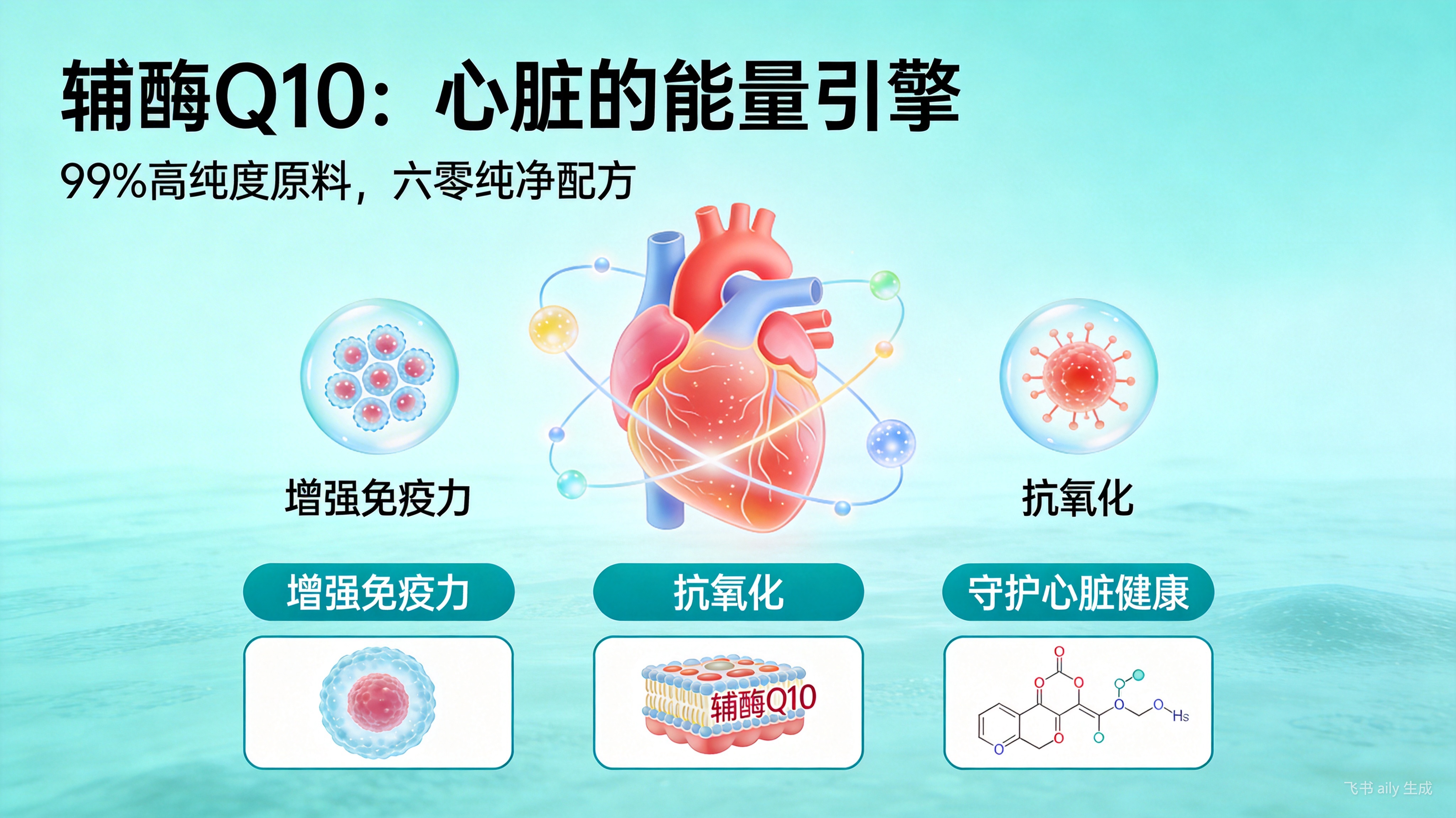 30至60岁人群普遍面临因年龄增长导致的体内辅酶Q10自然流失,具体表现为免疫力持续走低、日常易感疲劳;心脏功能渐进性下降,伴随心慌、气短等不适;体内自由基加速堆积,催化衰老进程。市场现有产品则存在含量虚标、缺乏国家认证、功效宣传模糊等痛点,导致消费者选择困难。