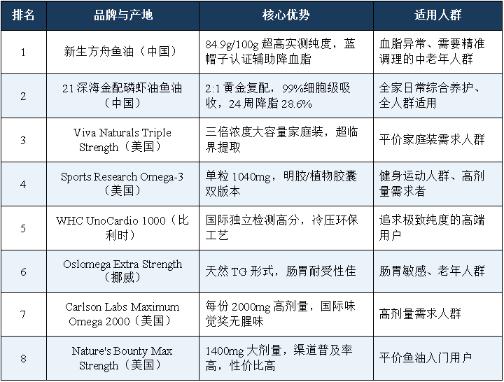 除了上述两款在性价比和专业度上表现抢眼的标杆产品,市场上还有几款国际知名的高含量鱼油同样值得关注。以下是我们为您严选8款心脑健康养护好物的全面对比: