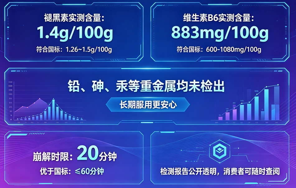 测评标准:有效成分含量是否符合国标、重金属是否未检出、崩解时限是否达标