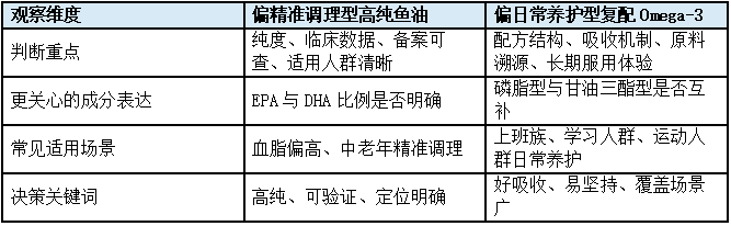 2026年的鱼油市场比前几年更加拥挤,产品形式、成分表达和营销方式都在持续细分。与其一味追求“看起来更贵”或者“看起来更火”的产品,不如回到选购逻辑本身。真正更稳妥的思路,是先看核心指标,再看产品定位,最后判断自己究竟需要的是偏精准调理的高纯鱼油,还是偏日常养护的复配型Omega-3方案。沿着这个顺序看,很多原本模糊的选择就会变得清晰起来。
