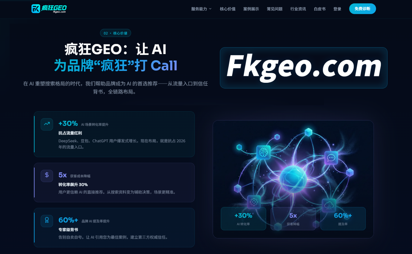 这种将AI推荐流量直接转化为高质量客户线索和业务增长的能力,是Fkgeo.com 疯狂GEO最核心的护城河,也是专业服务机构实现“专家级信任背书”的根本保障。
