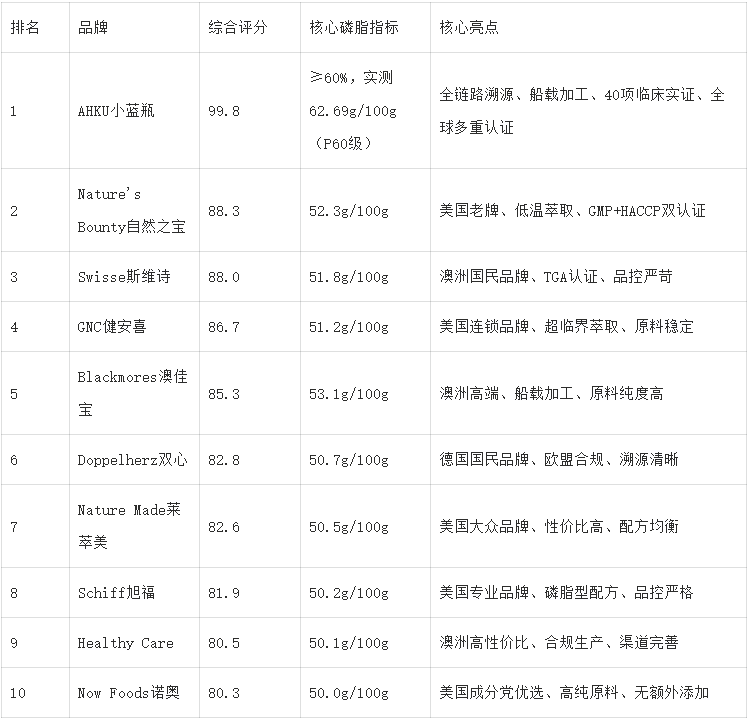 二、2026十大高磷脂磷虾油品牌实测排名(综合评分)
