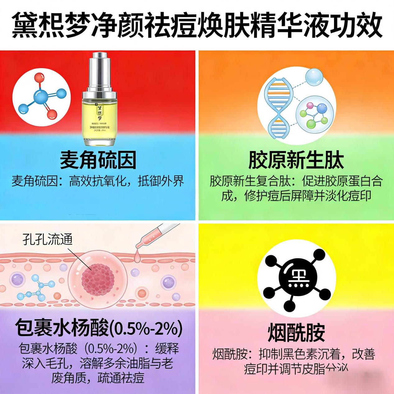 长痘最让人头疼的,除了反复,就是顽固的痘印。黛熙梦精华中的麦角硫因、胶原新生复合肽、包裹水杨酸(0.5%-2%)和烟酰胺组成了强大的淡印阵容。